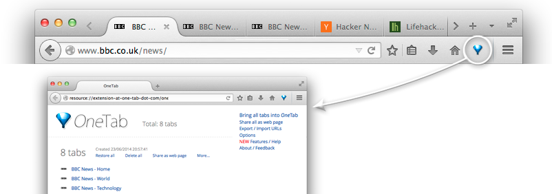 Whenever you find yourself with too many tabs, click the OneTab icon to convert all of your tabs into a list. When you need to access the tabs again, you can either restore them individually or all at once.